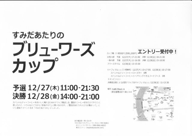 さて、久しぶりとなってしまった理由は置いといて、12/27、28に墨田区のコーヒー関連のお店を中心として、「すみだあたりのブリュワーズカップ」というイベントが両国のcafe black Aにて開催されるのでお知らせです。