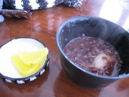 んで、しばらく滑って、おしるこー。漬物がいい感じ。
