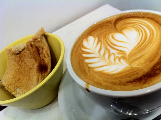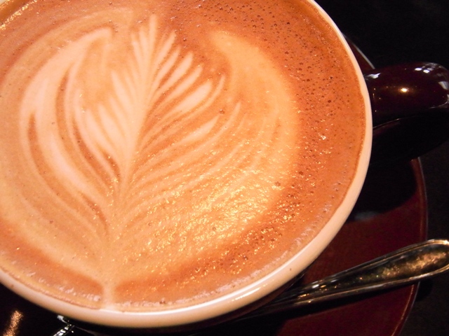 で、普通の珈琲飲もうと思ってたんですが、雨に濡れて寒かったんでジンジャーとカルダモンの入ったチャイのようなカプチーノ、ア・ラブチーノをいただきました。泡はもこもこ系。