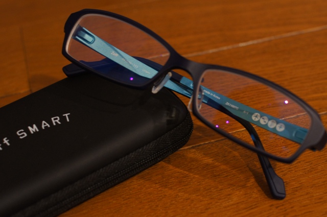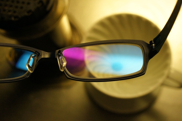 こんな感じにブルーライトが反射されますが、実際かけてみると慣れるまで内側の反射が気になりました。