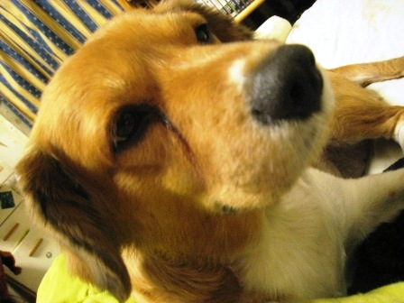 ビーチにいたお父さん風犬。