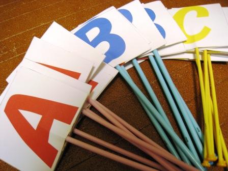 画用紙かって印刷して、編み物用の棒に貼り付けたもの。