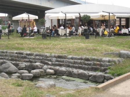 せっかくの川沿いオープンテラスという立地なんですが、あいにくの曇りで雨も降ったりやんだり。