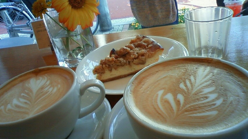 カフェラテとチーズクランチケーキ。
