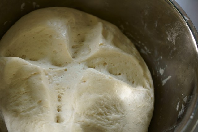 粉と塩を篩ってそこに砂糖とドライイーストをのっけてぬるま湯をかけるてこねてゆるめにラップをする。