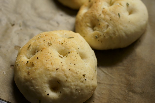 生地を5分割して丸めて天板へ。20分ぐらい二次発酵したら指で穴を付けてオリーブオイルを全体に塗って塩をかける。クレイジーソルトか岩塩がお勧め。