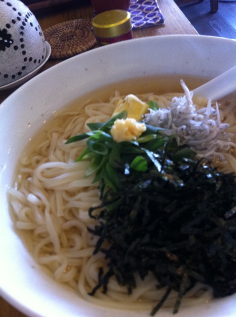 細麺うどんに関西だし。柚子の風味がよくてとってもおいしい。