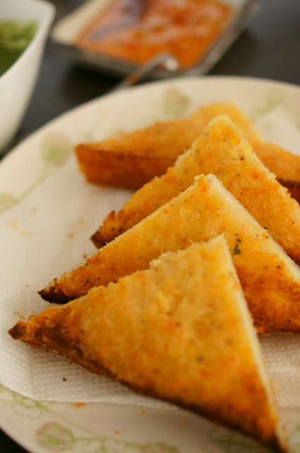 あとは片栗粉まぶした食パンに塗って170度で様子を見ながら揚げれば出来上がりー。